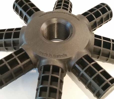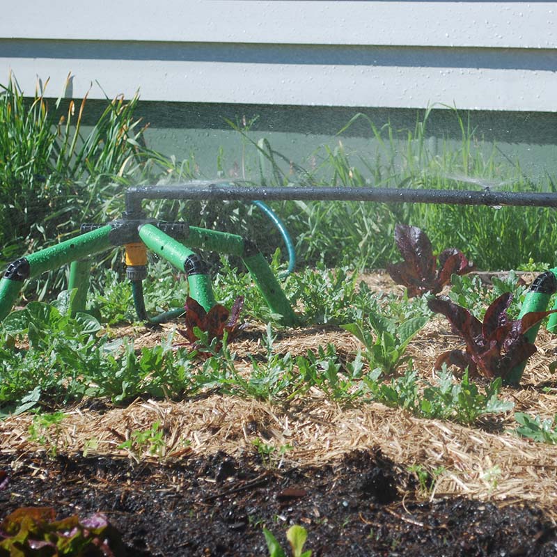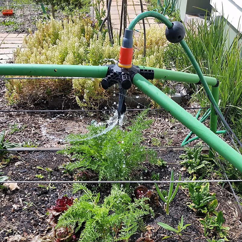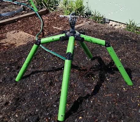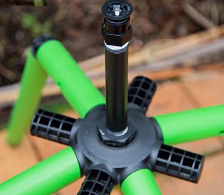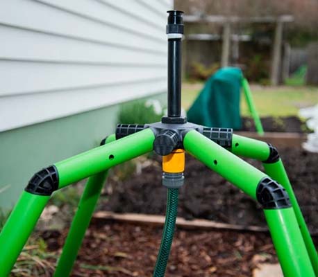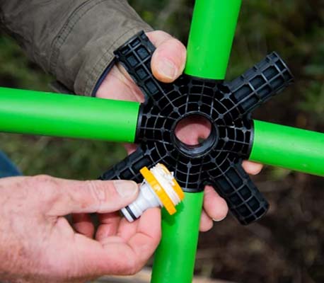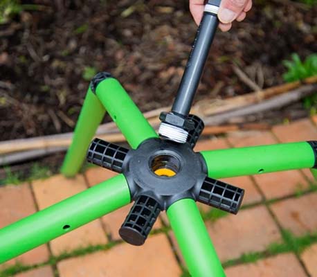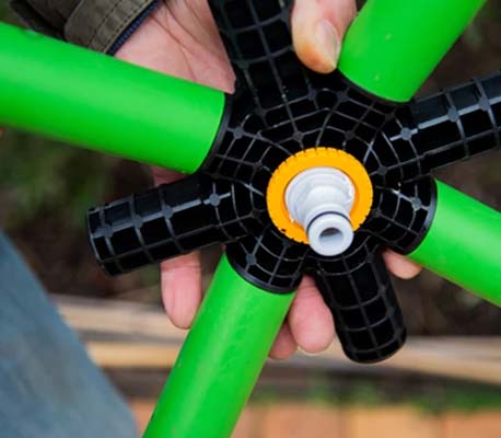 Flexi Garden Frames® can be used as the bases for drip irrigation systems for vegetable gardens or as a support for lawn irrigation sprinklers. You can connect watering components so that water sprinkles from the top of the hub, or out through the bottom, depending on your needs. And always remember to use plumbing tape to reduce leaks.